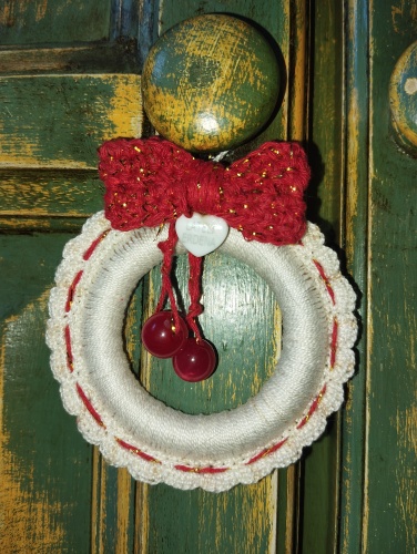 | Goutte plate tricolore | Goutte plate tricolore Coton blanc/ vert / rouge Lurex argenté Hauteur : 5.5 cm Diamètre : 5 cm |